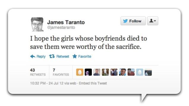 Taranto, who brags on his Twitter profile that Greg Gutfield once called him "sharp," later described his Tweet as "challenging." It is, I guess, a bit challenging for a Journal opinion writer to understand that selfless personal sacrifice doesn't occur within a rigorous cost-benefit analysis. Certainly, Taranto seems a bit challenged.