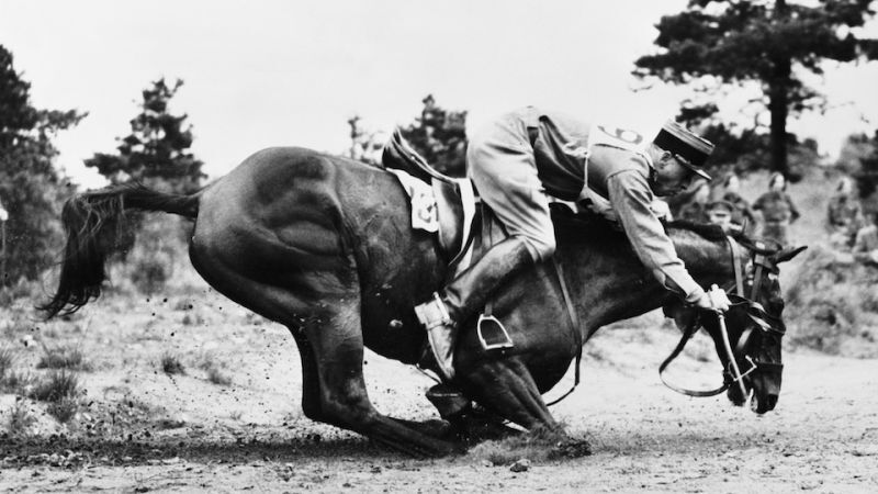 Photo: Getty. ("The horse ridden by Andre Jousseaume of France falls to its knees in the centre of the double road jump during the men's three day equestrian event at the Olympic Games, 12th August 1948.")