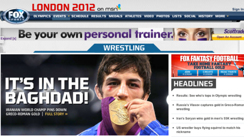 Here's the headline splash — as of publishing time, still up — on Fox Sports' Olympic Wrestling page. That's Hamid Soryan, who won a gold medal for Iran in Greco-Roman wrestling. Baghdad is the capital of Iraq. Next time they might want to consult a map.