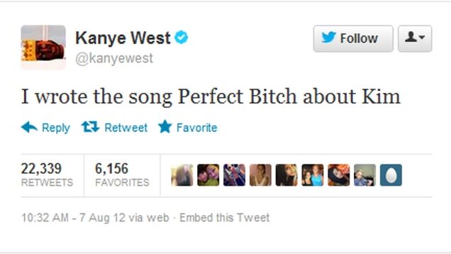 "I wrote the song Perfect Bitch about Kim," Kanye West tweeted today, referencing the new song he unveiled in NYC over the weekend.