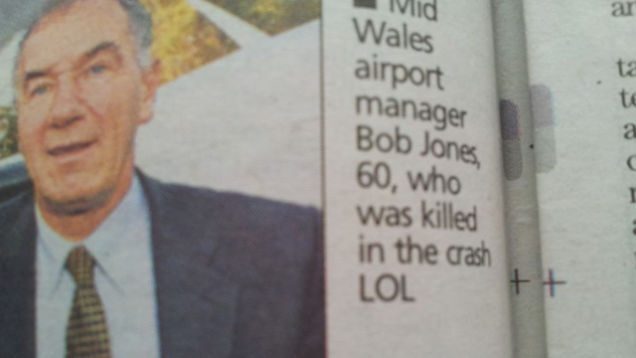 'LOL' Is Not an Appropriate Photo Caption for an Article About a Fatal Car CrashMax Read8/09/12 1:49pmFiled to: OopsLolJournalismCaptionsTweetgFbTop422EditPromoteDismissUndismissHideShare to KinjaToggle Conversation toolsGo to permalink From today's Western Mail. LOL. "The caption error in today's Western Mail is under internal investigation," a spokesperson tells the Press Gazette. "We apologise for any offence this error may have caused." [@Gwennys via Poynter] Reply42 repliesLeave a reply