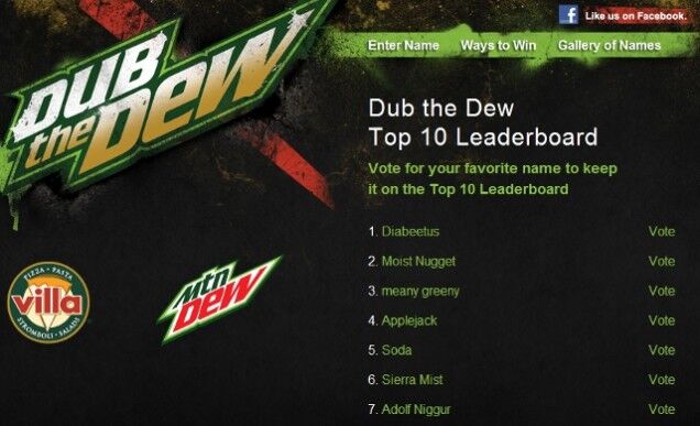 UPDATE: The "Dub the Dew" campaign was launched by Villa Fresh Italian Kitchen and not Mountain Dew. In a statement to AdWeek, a Mountain Dew rep said the company was "working diligently with our customer's team to remove all offensive content that was posted and putting measures in place to ensure this doesn't happen again."