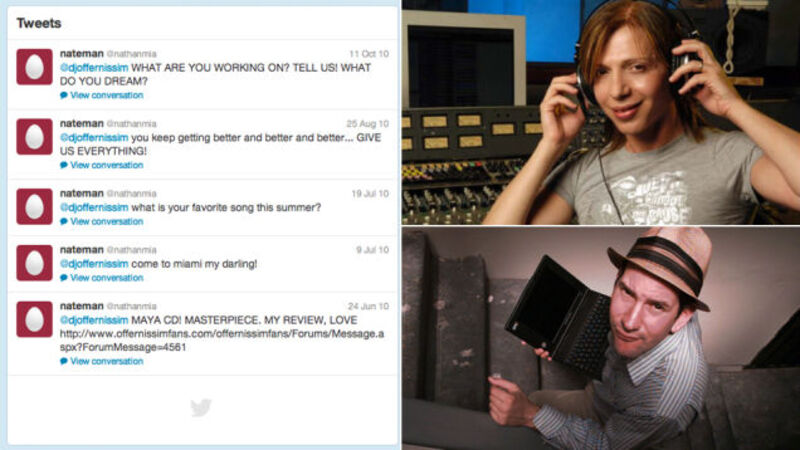 The account appears to have been created for one purpose: to talk to [Israeli DJ] Offer Nissim. Nissim is its only follow, and all five tweets are directed at the musician