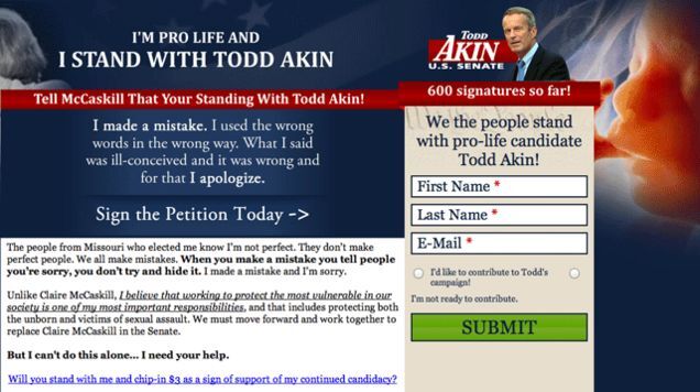 Todd "Legitimate Rape" Akin, the Republican Senate candidate who believes uteri have a rape exception, has launched a "Still Standing" website asking supporters to sign a petition. Actually, he's launched it three times, because whoever is writing his websites for him doesn't know the difference between "your" and "you're."