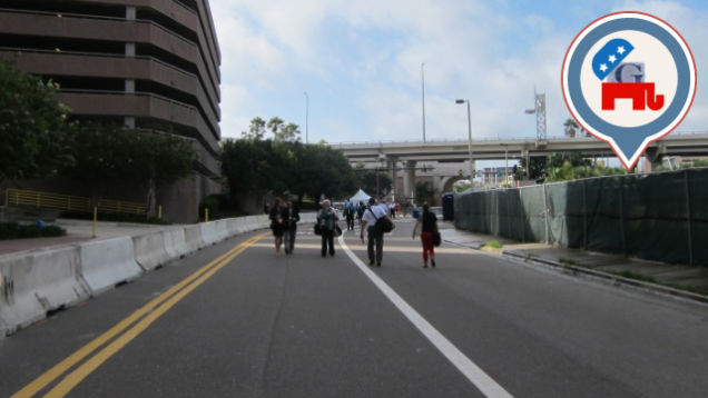 Which is, of course, what everyone should do at convention time, but given a normal news cycle with no humongo stories, the media industrial complex will always expand convention coverage to fill as much time as possible, because, look, we gotta give you people some shit to talk about every day, whether there's really anything to talk about every day or not. The real victims of this storm will not be the Louisiana refugees displaced from their homes; the real victims will be all of us, the foolish journalists who dutifully streamed into Tampa for what we all knew in advance would be a completely artificial non-event, and who now find ourselves stranded here, in the Floridian dead zone, forced to talk about Will Ann Romney's Personality Connect With Undecided Female Voters, as actual news happens just a little ways up the Gulf Coast. This morning, all of us in the press corps trudged through a downtown Tampa that resembles nothing more than post-Katrina New Orleans without the floods: empty streets, blocked-off underpasses manned by gun-toting National Guardsmen, and legions of glaring sheriff's officers scanning the sunburned crowd as we're forced through narrow fenced-in holding pens.
