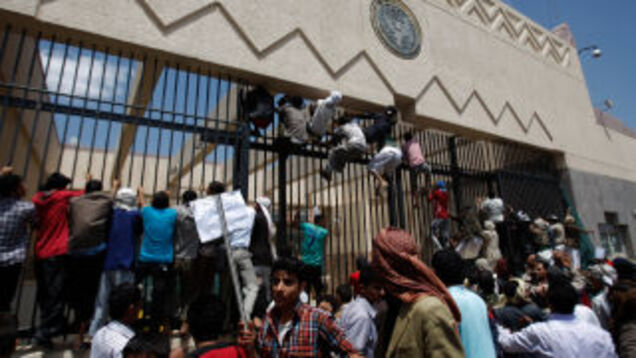 Hundreds of protesters managed to breach the outer security perimeter around the US embassy in Sana, Yemen for a brief period of time today before being repelled by guards.