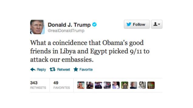 The reviews of Mitt Romney's reaction to the Libya crisis this week were uniformly damning. But Donald Trump, little orange scamp that he is, knows solid trolling material when he sees it. Which is why he just offered up the above tweet, which accuses the President of being friends with terrorists. Because at this point, why not? Your man Romney is getting his ass kicked in the polls, so why not lay all your cards out on the table and accuse the President of virtually everything possible? Terrorism. Murder. Incest. Once you've crossed the line into blatant slander, you may as well go all the way.