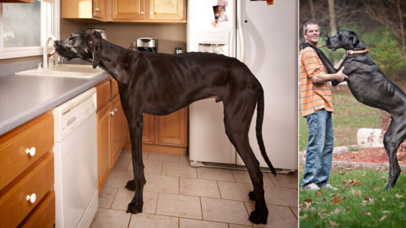 Meet Zeus, the world's tallest dog, as certified by the Guinness Book of World Records. How tall is Zeus? Zeus measures "44 in (111.8 cm) from foot to withers" (the withers is "the ridge between the shoulder blades of a four-legged mammal").