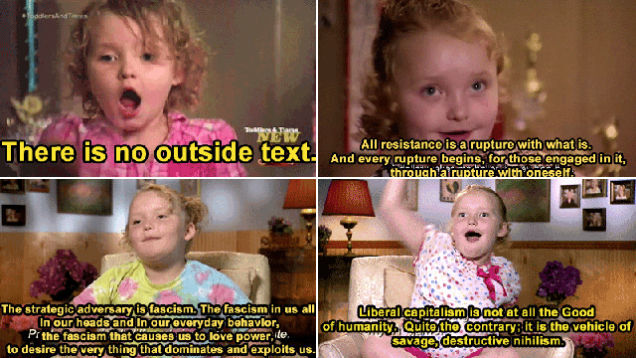 What is Honey Boo Boo, if not America's greatest public intellectual? And what is Here Comes Honey Boo Boo, if not an audiovisual genealogy of continental philosophy? And what is the internet for, if not GIFs that combine high culture and low culture to reveal the instability at such a binary's heart, and also for cheap laughs?