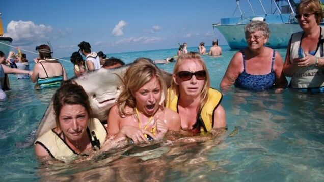 Reportedly snapped in Stingray City in the Cayman Islands, where tourists are encouraged to chum stingrays with ziplock bags full of ground-up squid meat.