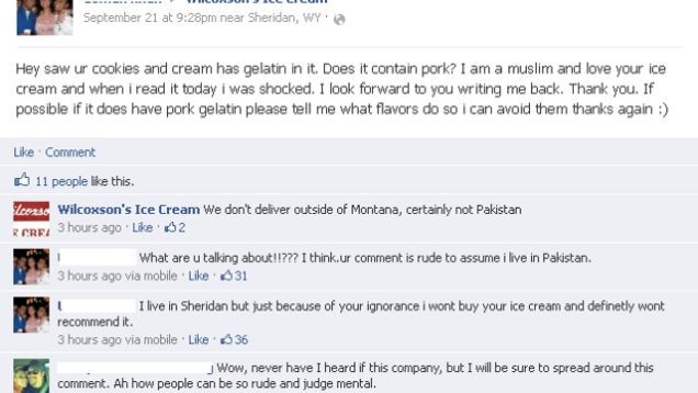 A Muslim Facebook user who wanted to know if Wilcoxson's Cookies and Cream contained any pork-based gelatin in it was met with a single-sentence response: "We don't deliver outside of Montana, certainly not Pakistan."