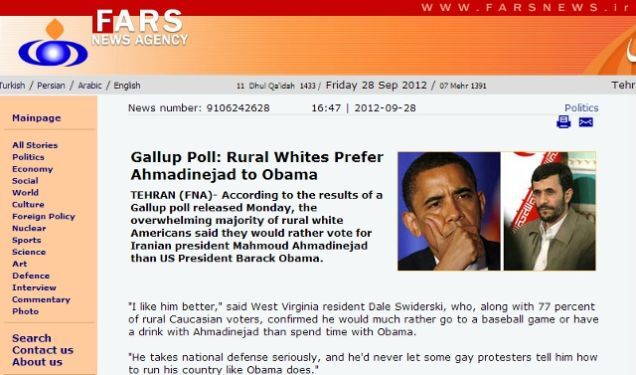 In an article published today on the FNA website — and likely picked up by other media outlets in Iran — the news agency quotes liberally from a Gallup poll claiming "77 percent of rural Caucasian voters...would much rather go to a baseball game or have a drink with Ahmadinejad than spend time with Obama," and 60 percent of the rural whites surveys "said they at least respected that Ahmadinejad doesn't try to hide the fact that he's Muslim."