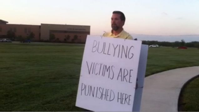Randy Duke, a 20-year law enforcement vet, only has a few weeks to spend with his family before heading back to Afghanistan to train police officers, and he definitely didn't plan on spending most of it outside his son's school holding a sign saying "Bullying Victims are Punished Here."