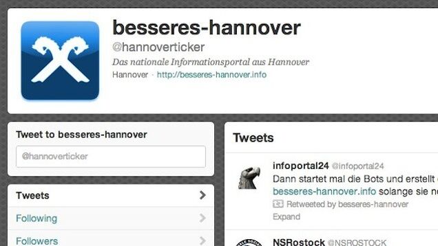 Back to the first official censorship: the group in question is called Besseres Hannover, and, since the ban only applies in Germany, the account is still viewable in the United States and elsewhere. According to the always reliable Google Translate, the group's recent tweets, the last of which was published on September 25, seem mostly benign. The group's webpage has been suspended or deleted.