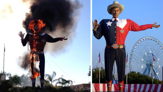 The 52-foot "Big Tex" statue that has welcomed visitors to the State Fair of Texas with a booming, "Howdy, folks!" for the past 60 years was completely destroyed in a terrifying burst of flames today.