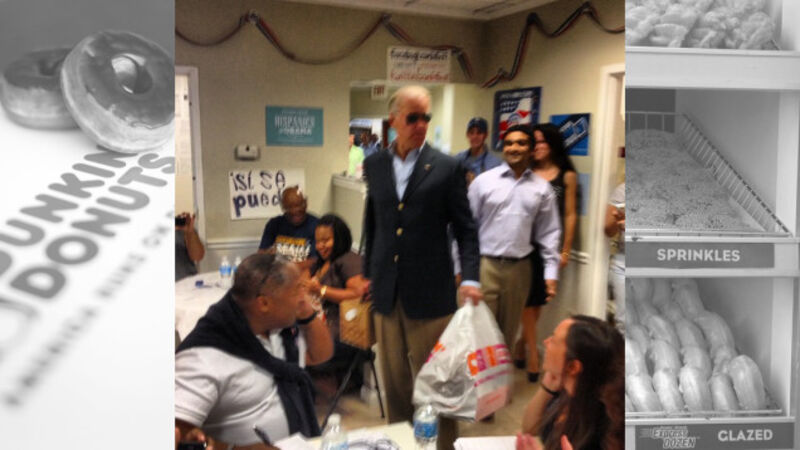 Yes, that's Joe Biden delivering a bag of Dunkin' Donuts and a carton of coffee to a Field Office in Florida. He is wearing a very nice navy-blue blazer with gold buttons, slacks, and a pair of aviators because that is what Joe Biden wears to go pick up Dunkin' Donuts. No, he did not once look this serious during his debate with Paul Ryan.