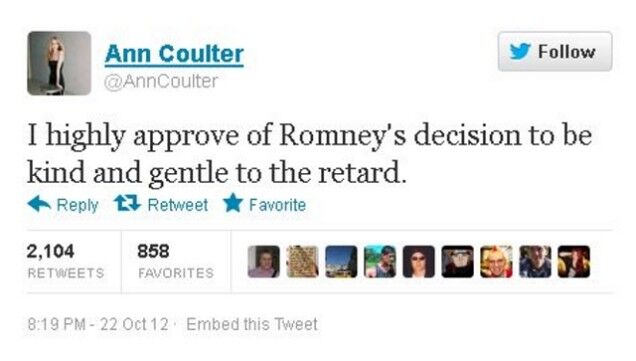 Professional troll Ann Coulter was particularly wicked — even by professional troll standards — following Monday night's debate when she referred to President Obama as a "retard" in a tweet.
