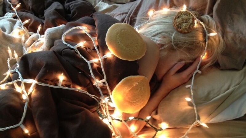4. While they sleep decorate the Glamorous Drug Addict with Christmas lights. Also, since they sometimes refuse to eat too much because getting fat during a hurricane is super-lame, just put any food they may have requested on top of them to remind them that they need to eat between 12 hour naps. Pancakes are good, so are oatmeal raisin cookies. (See: Above photo)