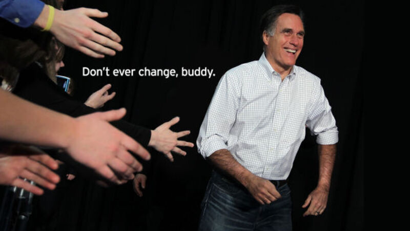 Even his most ardent critics probably have to admit that they already kind of miss the bugger, with his Reed Richards hairstyle, his ironed mom jeans and his total inability to relate to human beings. There were enough flashes of genuinely trying to Mitt Romney's campaign to make you feel that there might be a vulnerable, confused, utterly inapt person locked inside the campaign and "candidacy demeanor" machine. I felt myself vacillate between a complete lack of respect and a sad pity for whatever person was trapped beneath a consuming desire to vindicate his father and efface his own political losses. And because there were, even briefly, signs of a person in there, it was easy to laugh off his stumbling boobery and feel sort of bad about it—dust yourself off, Mitt, and get back on the bicycle and keep pedaling. It was easy to feel a little defensive for him, too, when the carrion birds of the conservative commentariat gutlessly pecked at him to bolster their pundit cred and pave the way for an "I CALLED IT" column in the weeks following the election. Then, just as that empathetic wave would start to crest, he'd lie about something remorselessly. He'd lie about welfare, or Libya, or an apology tour, or his deficit reduction plan, or the efficacy of his naval expansion plan, or his abortion views, or his Obamacare views, or Obamacare's impacts, or Social Security, or Medicare, or tax revenues, or "religious freedom," or whatever. And all the goodwill would wash away, and he'd still be standing there—smugly, proudly, saying things that you knew he was too smart to think could possibly be true. Then he'd take some Inspector Clouseau-esque nosedive off the end of a precipitous sentence; someone would cue the slide-whistle noise; you'd think, "Oh Mittens-chan..." and the cycle would begin anew.