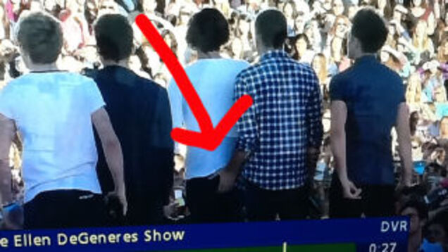 Malia Obama's favorite band One Direction were on Ellen yesterday. Blindfolded fans felt them up, the uber-doober British boy band performed a song, and Liam Payne touched Harry Styles in the pooper. You can see it in the screenshot right there.