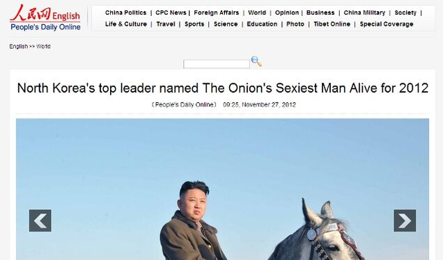 Which is probably why our chief exporter of both — The Onion — was able to fool the Chinese Communist Party's official mouthpiece into believing they actually named North Korea's supreme leader Kim Jong-Un 2012's "sexiest man alive."
