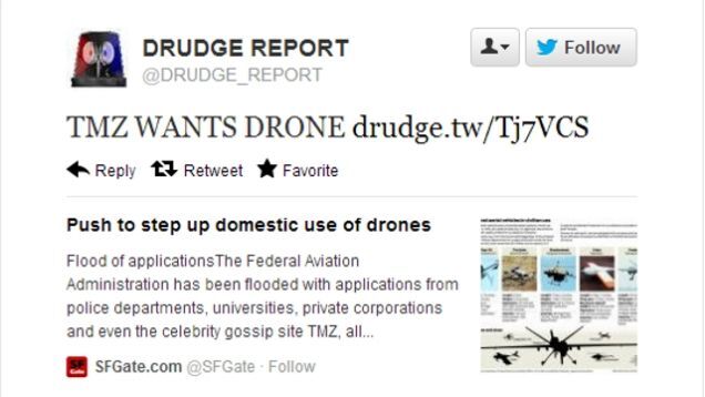 According to the Chronicle story, which was linked to earlier today by Drudge, a rush by the government to allow domestic use of drones has resulted in the FAA being inundated with applications "from police departments, universities, private corporations and even the celebrity gossip site TMZ."