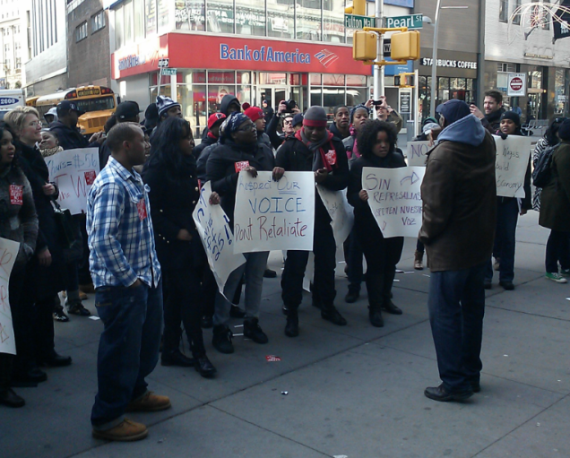 By 11:30 this morning, several dozen people wrapped in winter coats and wielding hand-drawn posters had assembled on the corner in front of the Wendy's on the Fulton Mall in downtown Brooklyn, across from the Modell's and the Bank of America, with the purpose of addressing that most fascinating question in labor relations: Can fast food workers ever be unionized? Here, in New York, today, a lot of fast food workers decided to skip the theory and proceed directly to the "Fuck you, pay me" phase of the process.