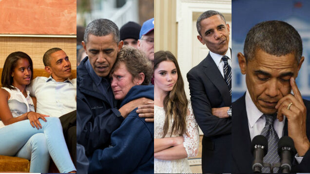 It's been this way from the beginning. Remember Obama in a suit, a cigarette dangling from his lips, looking like one bad motherfucker? Or that incredible photo of the President bending over at the White House, letting five-year-old Jacob touch his hair? But 2012 was the year of the pizza-shop bearhug, the teary-eyed thank-you speech, and the Oval Office meme-shot, "Barack Obama is not impressed." (Pretty sure he got slapped after this though.)