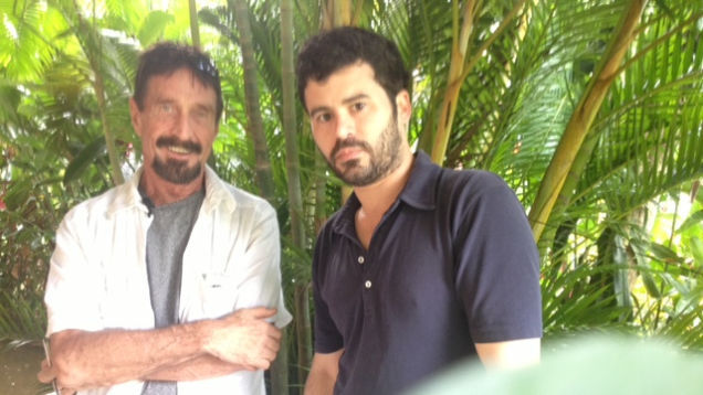 Grizzled geek paranoiac John McAfee (left, with Vice editor-in-chief Rocco Castoro) was arrested in Guatemala last week after Vice Magazine accidentally revealed his location by including his GPS coordinates in the photo above, which they posted while he was fleeing a murder investigation in Belize. That is crazy enough. But now McAfee, still being held in Guatemala, claims that Vice purposely set him up to score an exclusive.