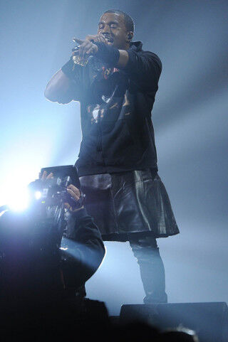 At last night's 12-12-12 benefit show at Madison Square Garden, Kanye West paced around a dark, empty stage, cranking out a 20-minute medley of recent and past hits (from "Clique" to "Gold Digger"). But what made a bigger impression than his stamina was the leather skirt and leggings combo he wore onstage. The hubbub was stupid for at least two reasons: