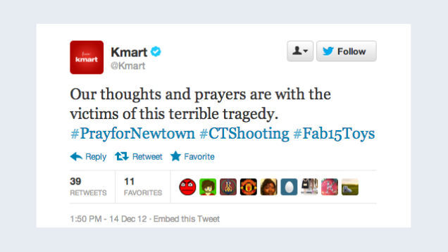 It's been about six hours since the tragic shooting in Newtown, Conn., which means we're right on schedule for a tone-deaf corporate social meda account fuckup. And here it is: "Our thoughts and prayers are with the victims of this terrible tragedy," K-Mart tweeted after the shooting in Connecticut. With these three very appropriate hashtags: "#PrayforNewtown #CTShooting #Fab15Toys."