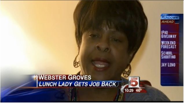 A woman who was fired from her job in an elementary school cafeteria earlier this week after giving free lunch to a needy student has been given her job back, according to Missouri's Channel 5 News. Dianne Brame had been employed as the cafeteria manager for Hudson Elementary for the last three years; she began giving free lunches to the student, a fourth-grader, after she realized his name was listed under the free lunch program but his eligible status had expired.