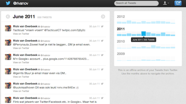 Twitter has started rolling out an archive function that lets you download all your old tweets in an easily searchable format. It looks like this, and should be available to everyone soon. Luckily, it appears this is not a publicly-accessible archive, only something for you to download in order to reminisce privately over the stupid shit you said three years ago, while weeping alone in your bedroom because you're sad that you have nothing better to do.