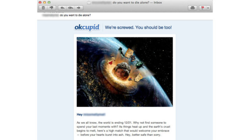 (In all likelihood, we're guessing, OK Cupid is not suggesting that an enormous Obama meteor will kill us all tomorrow, and whoever sent out the email just grabbed the first "apocalypse" graphic he or she could find, settling on this one without noticing that it, uh, isn't really appropriate for an OK Cupid email.)