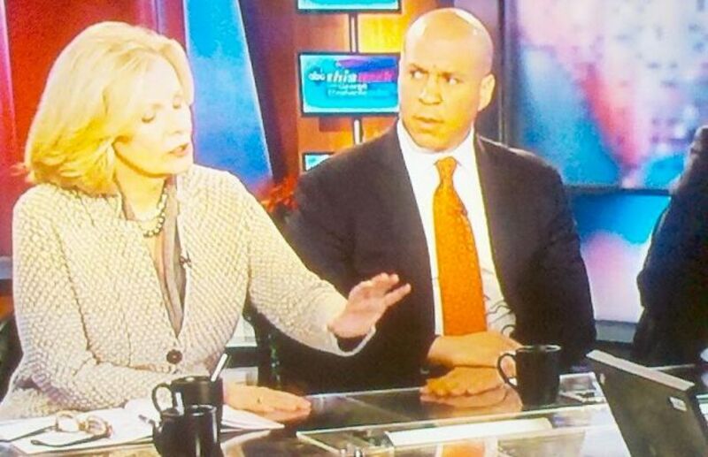 Here's a picture of Cory Booker reacting to Peggy Noonan on ABC's This Week with George Stephanopoulos. This was his expression when he heard her say that video games were to blame for gun violence in America. It's the same look that TV viewers at home have been giving to Peggy Noonan for years. Major props to Cory Booker for putting it out there on national TV.