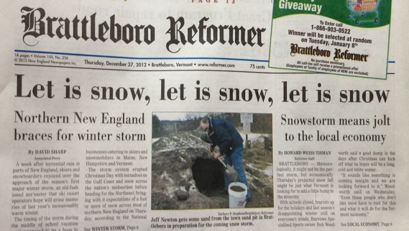 There are lots of wonderful things about spending a week in my hometown, Brattleboro, Vt. Here we have a stocked kitchen, two dogs, a fireplace, and the maple syrup flows from the sink faucets. And as of this morning, there is lots of snow. So much snow that the local newspaper, the Brattleboro Reformer—which is wonderful but like any local newspaper has a history of making unfortunate typos—led with it on page one.