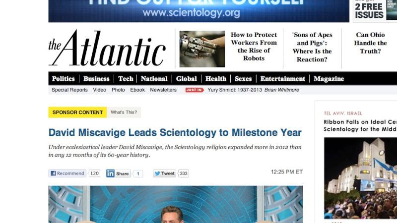 The Atlantic –- the one time publisher of Mark Twain, Nathaniel Hawthorne and Edith Wharton –- is now publishing Scientology propaganda. The "sponsored content"</a, bought and paid for by the Church of Scientology, went up Monday around noon and features all sorts of breathless praise for Scientology and its alleged growth last year.