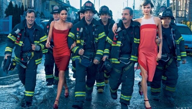In fairness to Vogue, while the photos are discombobulating at best, the accompanying captions are indeed devoted to the selflessness of first responders. (Well, mostly: ..."'It's a lifesaving branch-it's what we do.' From left: On Kasia Struss: Ralph Lauren Collection dress...")