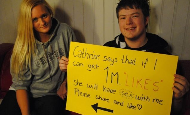 Taking his cue from the kids who convinced their parents to give them a puppy after getting 1 million likes on Facebook, Petter Kverneng of Norway got his high school crush Catherine to agree to sleep with him if he secured as many Facebook likes himself.