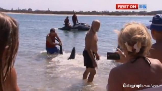 Aptly named tourist Paul Marshallsea of Wales responded to cries of "shark" by jumping in the water and grabbing the giant fish by its tail to yank it away from young children who were swimming close by.