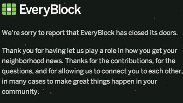Hyperlocal news site EveryBlock announced today it was shutting down for good. The closure marks an unexpected end to the site, which was once hailed for its innovation and ideas; the phrase "future of journalism" was once tossed around in reference to the site.