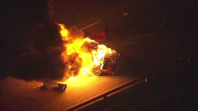 Fans of police chases were in for a treat last night when a freeway pursuit of a suspected drunk driver in a red Chevrolet Camaro ended with the car slamming into the sidewall and bursting into flames.