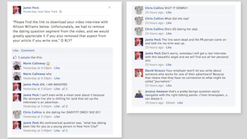 Jamie Peck, a writer for The Gloss, recently interviewed Allison Williams for the site Crushable. At the end of the interview, she asked her the innocuous question, "What has dating been like for you as a young person in New York City?" At that—as Peck related on Facebook in a conversation supplied by a tipster—the interview was cut off by Williams' PR person, who later emailed her to say "Unfortunately, we had to remove the dating question segment from the video, and we would greatly appreciate it if you also removed that aspect from your article."