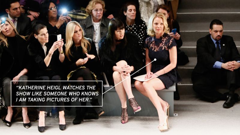Katherine Heigl watches the show like someone who knows I am taking pictures of her. She is one of the few people in the room not holding up a phone toward the runway, jotting down notes, or discreetly taking pictures of Katherine Heigl.