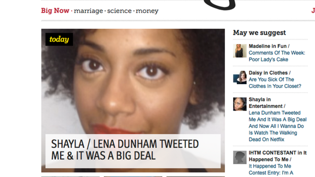 —we will simply encourage all of you to take a moment today to read, and re-read, all 1,139 words to find out What It Was Like When Lena Dunham Said Something to Shayla on Twitter. (A big deal? We're not telling!) The essay can be found splashed conveniently atop the page at XOJane.com. You can't miss it.