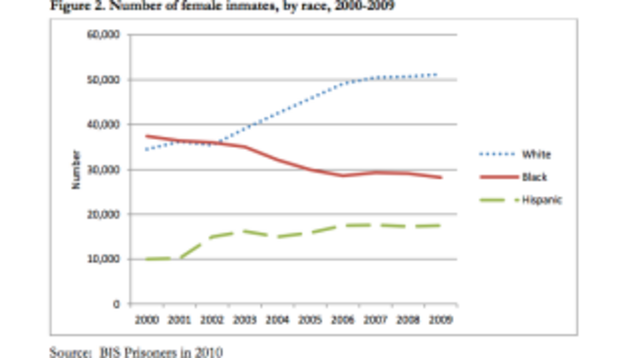 Those numbers are huge, particularly for black women. Why the change? There are no pat answers, unfortunately, because we love pat answers. The report points to factors including: falling crime rates; changes in drug sentencing laws and mandatory sentencing; changes in the types of crimes being committed by different demographics; and socioeconomic changes. Feel free to speculate wildly in the comment section without reading the carefully assembled report, also.