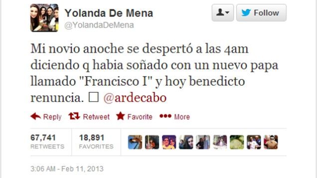 According to a tweet sent out by Yolanda De Mena of Madrid on the morning of February 11th, her boyfriend Alejandro Rodriguez woke her up very early that same day and told her he had just had a dream about a new Pope named Francisco I.