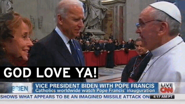 What did Vice President Joe Biden and newly-ensconced Pope Francis talk about in their brief conversation on the long receiving line following the new pope's first mass? It's probably best left to historians and Joe/Frank 'shippers (#Friden), but one imagines the working class came up, as it often does (we hear) in conversation with both Biden and the former Cardinal Borgoglio. It was a brief chat, in any event; 70-year-old Biden was polite enough to let the 76-year-old pope off the hook quickly (unlike, who was that, the wife of the President of Portugal? Who talked his ear off), and Francis continued his long meet and greet, which included Zimbabwean president Robert Mugabe, barred from EU travel but allowed in the Vatican. The mass that preceded the receiving line was short and simple, focused on the poor and the call to service; it drew a large (and loud) crowd to receive communion from priests carrying yellow umbrellas. If nothing else, Biden seemed to have a good time:
