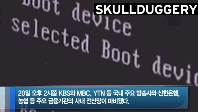 South Korea's three main broadcasters and two of its major banks were paralyzed on Wednesday by a massive outbreak of malicious code that crashed and displayed "skulls" on some computers, thought by many to be a retaliatory cyberattack from North Korea. The television channels KBS, MBC, YTN and the banks Nonghyup and Shinhan Bank had their computer systems simultaneously shut down at around 2 p.m., with employees unable to boot up their computers or access the internet; by 4 p.m., the systems had been restored. Media outlets were able to continue broadcasting, but Shinhan found that its internet banking and some ATMs were rendered inoperable. The South Korean government has launched an investigation and upgraded its information operations condition; North Korea has been threatening to launch a cyberattack since last week, when it accused the U.S. and South Korea of hacking computers in Pyongyang. The hack is believed to have come through services provided by LG. [BBC | Korea Herald | AJE]