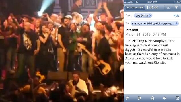 Late last week, the band posted a screenshot to its official Twitter account showing one of several threatening emails they've received since Casey and others forcibly removed a sieg heil-ing skinhead from the stage during a St. Patrick's Day concert, warning them not to perform in Australia or risk the wrath of local neo-Nazis "who would love to kick your ass."